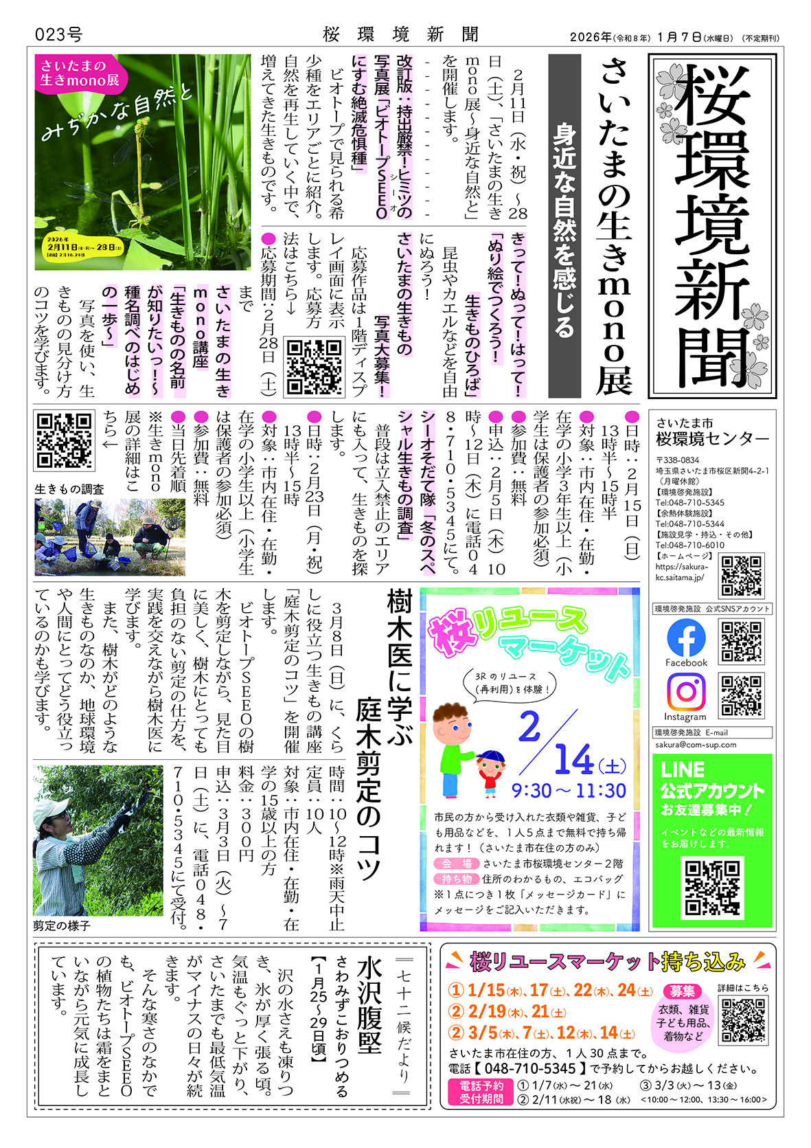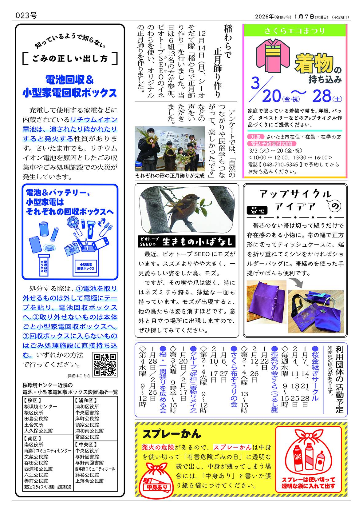 ・「さいたまの生きmono展」イベント告知 ・くらしに役立つ生きもの講座「庭木剪定のコツ」イベント告知 ・ シーオそだて隊「稲わらで正月飾り作り」イベント報告 ・ごみの正しい出し方「電池回収&小型家電回収ボックス」 ・「アップサイクルのアイデア」 など