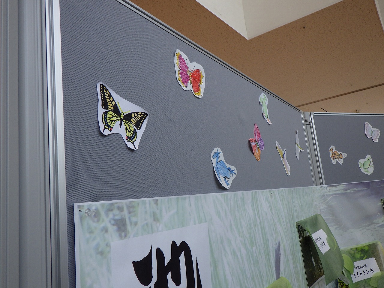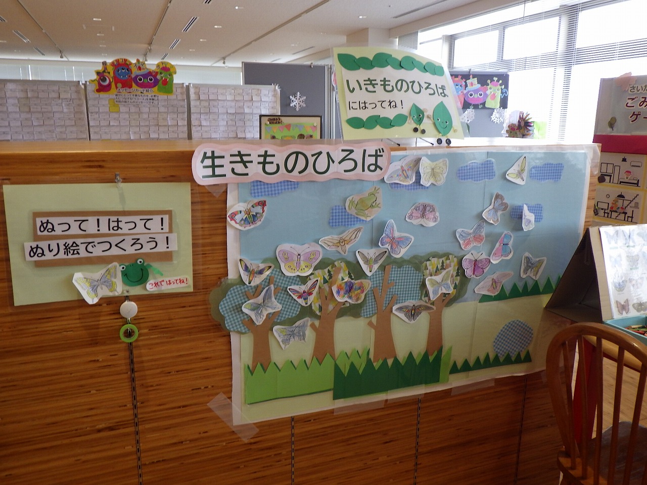 環境啓発施設2階3Rコーナーに設置した、紙面に作った生きもの広場。